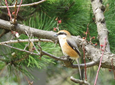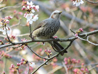 | ヒヨドリ[3月28日] こちらはソメイヨシノ、蜜を求めてやって来ました | モズ[3月28日] もう子育て中だと思います | |