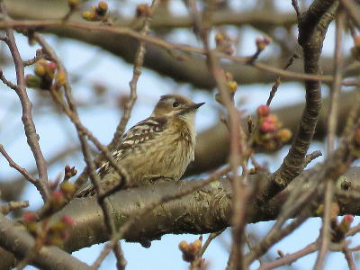 | コゲラ[3月26日] ギーギー鳴きながら未だ蕾の桜の木にやって来ました | シロハラ[3月26日] 一瞬明るい所に出てくれました | |