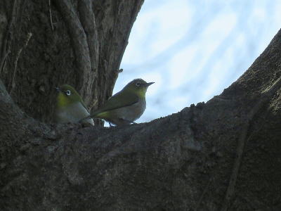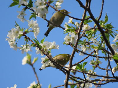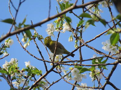 | メジロ[3月19日] メジロの他にヒヨドリも来ていて賑やかでした | メジロ[3月19日] ヤマザクラの蜜を吸っています | |