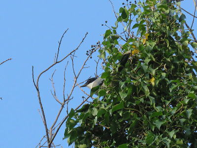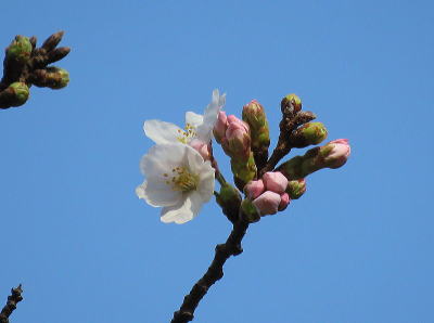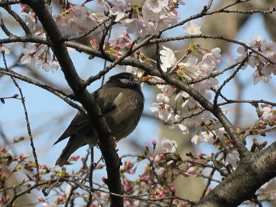 | オナガ[3月19日] 群れでキヅタの実を食べに来ていました、ヒヨドリも来て大賑わいです | ソメイヨシノ[3月19日] ついに開花しました | |