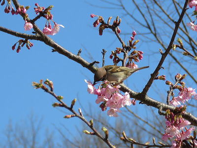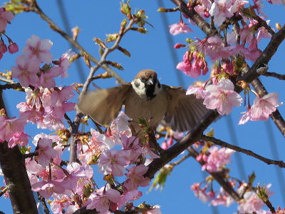| スズメ[3月1日] 蜜が溜まっている所を千切って食べていました | スズメ[3月1日] 河津桜にスズメがやって来ました | |