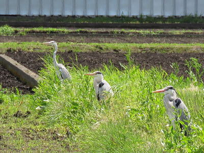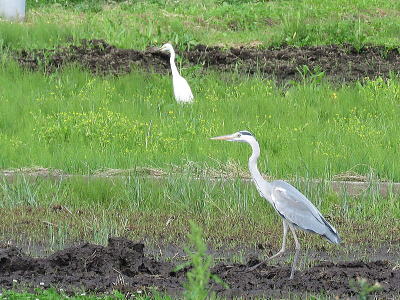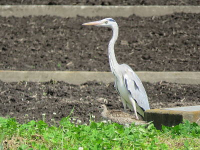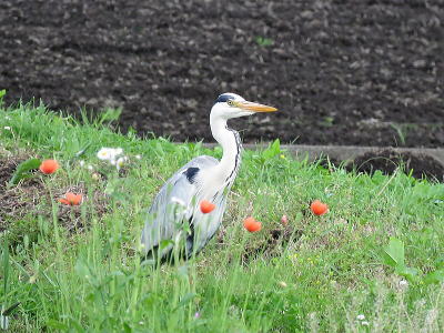| アオサギ、チュウサギ[4月29日] チュウサギは1羽残っていました | アオサギ[4月29日] 花に囲まれすまし顔です | |