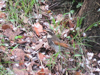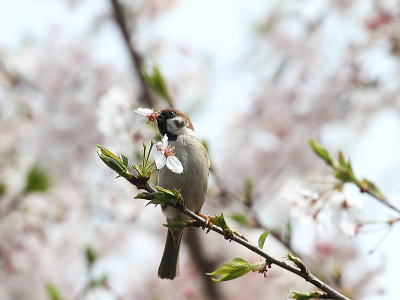| スズメ[4月9日] 花を千切って食べています | 桜の絨毯[4月9日] 風が吹くたび見事な花吹雪が見られます | |