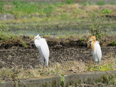 | アマサギ[5月15日] ほぼ夏羽になっています | チュウサギ、アマサギ[5月15日] 今日居たのはチュウサギは2羽、アマサギは1羽です | |