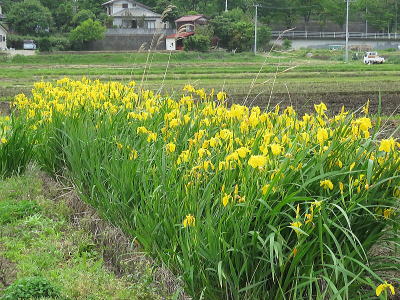 | キショウブ[5月6日] 用水路の横で満開でした | ツバメ[5月6日] 何羽も飛んで来て泥を持って行きます、イワツバメも来ていました | |