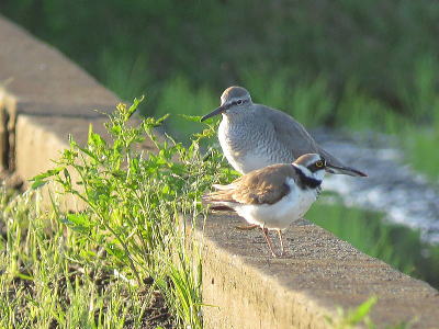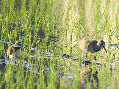 | キアシシギ[5月12日] 時間も遅くなりお休みモードに入ったようです | コチドリ、キアシシギ[5月12日] 田植えの終わった田んぼを歩いていきます | |