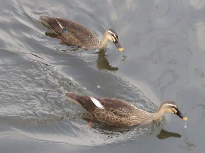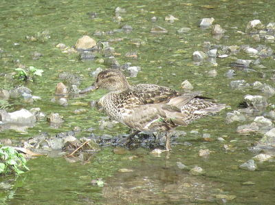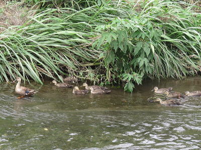 | コガモ[6月30日] 傷んだ左羽を入念に手入れしていました | カルガモ[6月30日] 9羽連れの親子です |