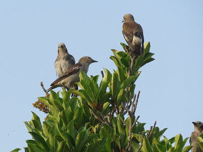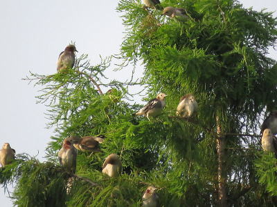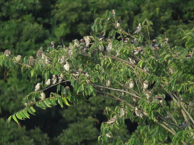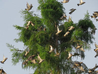 | コムクドリ[7月28日] 大きな木を次々に変えて移ります | コムクドリ[7月28日] 大きな木に群れで止まり、しばらくするとまた飛び出します | |