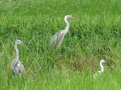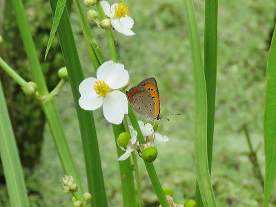 | ベニシジミ[8月23日] オモダカの花の蜜を吸いに来ました | アオサギ、コサギ[8月23日] チュウサギも居ましたが飛ばれてしまいました | |