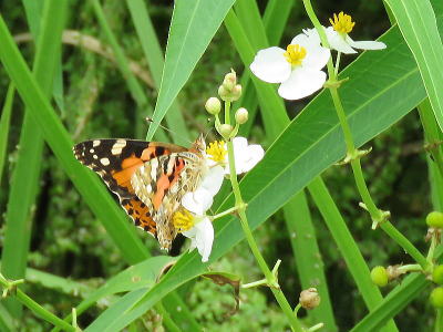 | スズメ[8月23日] 稲が実り喜んでやって来ました | ヒメアカタテハ[8月23日] 近くのオモダカに来ていました | |