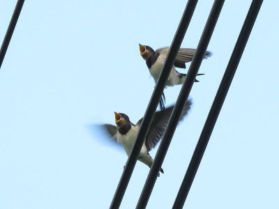 | ツバメ[8月11日] こちらは親が餌を持って来たようです | ツバメ[8月11日] 2番子でしょうか、親が餌を持って来くれるのを待っています | |