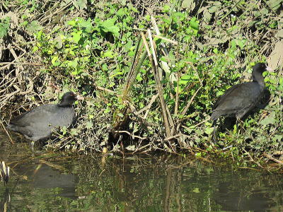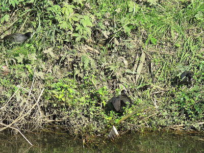 | オオバン[11月3日] 岸に上がり草を食べたり、羽繕いしています | オオバン[11月3日] 大庭大橋の南に4羽居ました | |