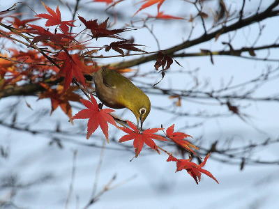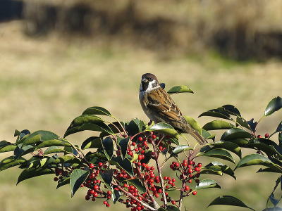 | メジロ[12月2日] 葉っぱに付いている虫を食べています | スズメ[12月2日] この実を食べに来た訳ではなさそうでした | |