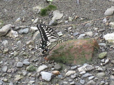 | カワセミ[6月27日] 幼鳥には餌獲りは難しそうです | アゲハチョウ[6月27日] 河原の石に止まり吸水しています | |