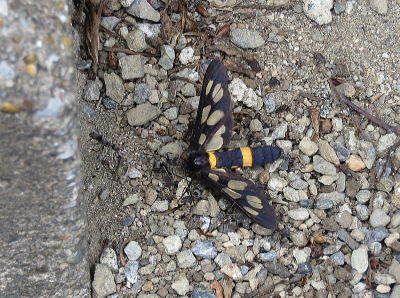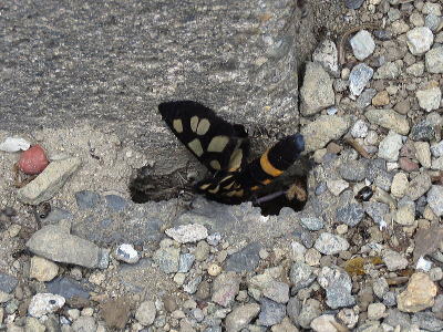 | アリ、カノコガ[6月11日] 一瞬で巣穴に引き込みました | アリ、カノコガ[6月11日] 数匹のアリがよいしょよいしょとカノコガを運んでいました | |