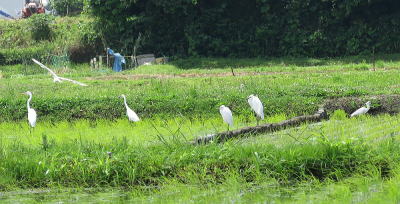 | アマサギ[6月6日] 若鳥のようです | ダイサギほか[6月6日] ダイサギ2羽、チュウサギ4羽、コサギ1羽、アマサギ1羽いました | |
