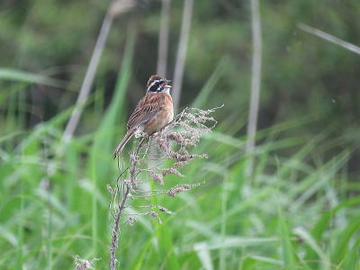 | カルガモ[6月9日] 嬉しそうに走り回って小魚を獲りました、一呑みです | ホオジロ[6月8日] 一生懸命囀っていました | |
