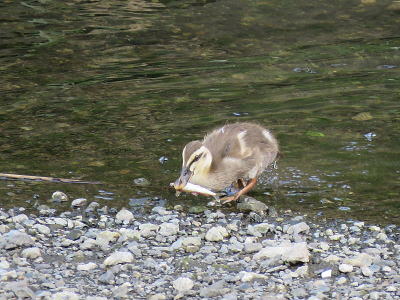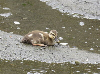 | カルガモ[6月7日] たっぷり動き回り疲れてお休みです | カルガモ[6月7日] 何かを食べています、魚のようにも見えますが | |