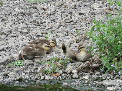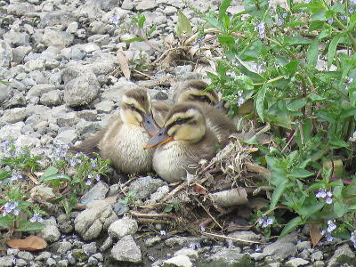 | カルガモ[6月7日] 見つかりにくいように草の陰で体を寄せ合っています | カルガモ[6月7日] お母さんの近くに寄って来ます | |