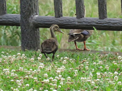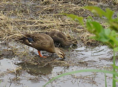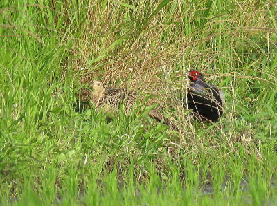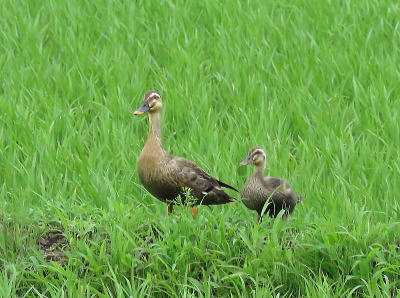 | キジ[6月24日] 田んぼの畔にキジの番がいました、雛は連れていません | カルガモ[6月24日] 幼鳥5羽連れがいました、こちらはもう大きくなっています | |