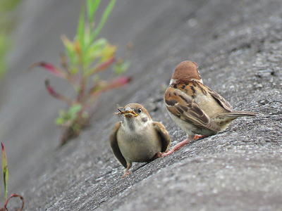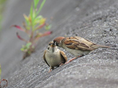 | スズメ[6月29日] 大きすぎて食べきれず、親が手助けしていました | スズメ[6月29日] 親から餌を貰いましたが、 | |