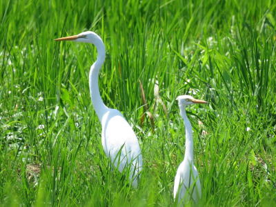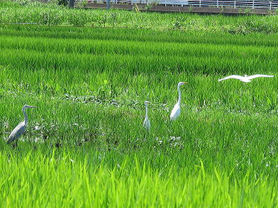 | アオサギ、チュウサギ、ダイサギ[7月31日] 田圃の中で餌獲りです | チュウサギ、ダイサギ[7月31日] 合わせて数羽が餌獲りをしていました | |