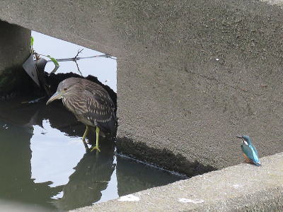 | ゴイサギ、カワセミ[8月24日] カワセミはゴイサギに追い払われてしまいました | カワセミ[8月24日] 幼鳥です | |
