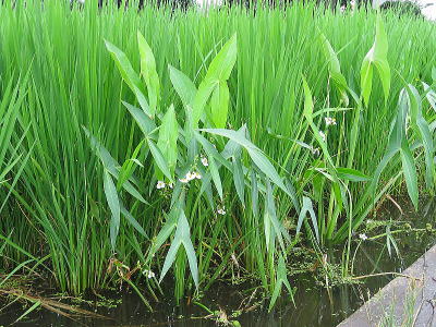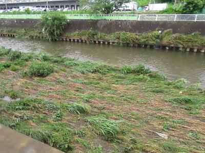 | オモダカ[8月2日] 田んぼでは花が咲いていました | 引地川[8月2日] 昨日の豪雨、TVニュースで警戒水位を超えたと言っていました、河原や護岸の草がなぎ倒されています | |