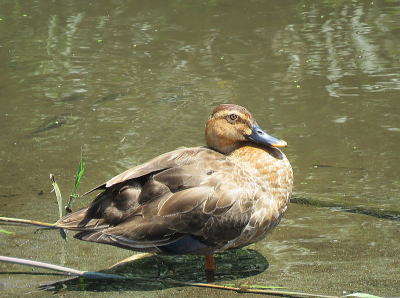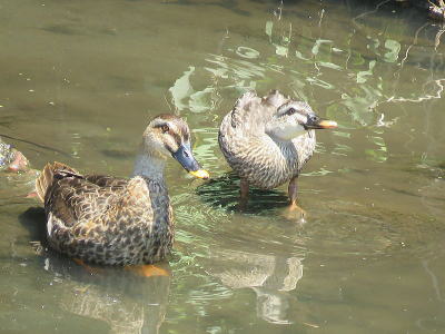 | カルガモ[7月31日] やけに赤ら顔ですね | カルガモ[7月31日] 親子です、幼鳥は水をゴックン | |