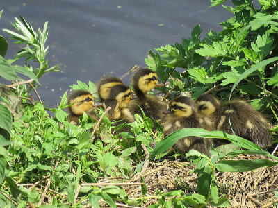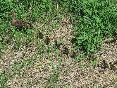 | カルガモ[7月31日] ヒナ達も川に下りました、一安心です | カルガモ[7月31日] 母さんは川に下りました、どうしようとヒナ達が慌てています | |