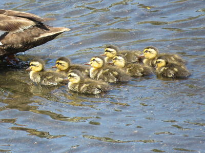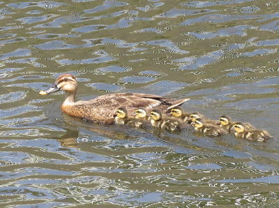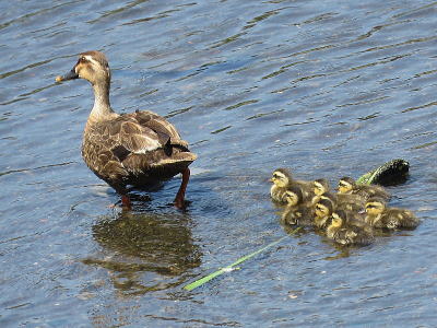 | カルガモ[7月31日] この時期でもヒナが見られるのですね | カルガモ[7月31日] ヒナは全部で8羽です | |