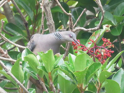 | アオサギ[8月1日] トンボの行方を追っていました | キジバト[8月1日] 美味しそうにサンゴジュの実を食べています | |