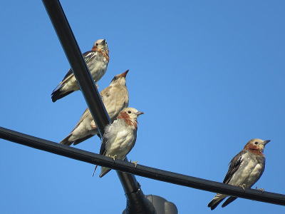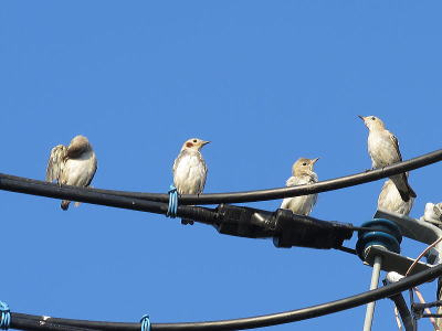 | コムクドリ[7月31日] 幼鳥も混じっています | コムクドリ、ムクドリ[7月31日] 近くのケヤキの大木にコムクドリの大群がいました | |