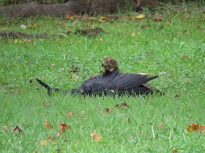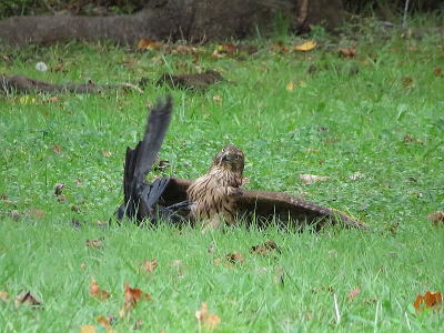 | オオタカ、ハシボソガラス[8月27日] これからの展開を期待しましたが、ランニングの人が近づいたため離して飛び去りました | オオタカ、ハシボソカラス[8月27日] 急にバサバサと音がして、飛んでいるカラスをオオタカが捕まえたようでした | |