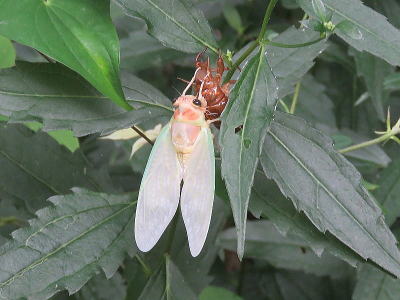 | キツネノカミソリ[8月1日] 今年はこれ1本、一面に咲いていた年もあったのですが | セミ[8月1日] セミの名前は分かりませんがこんな時間(8:30)に羽化していました | |