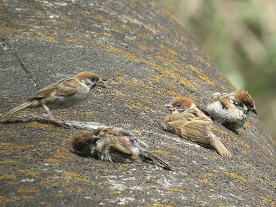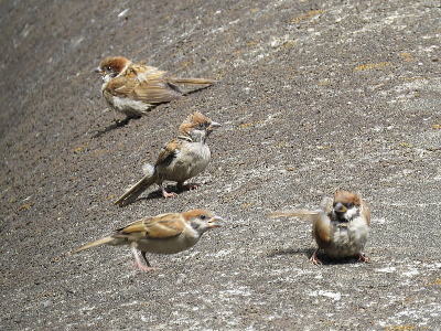 | スズメ[8月5日] こんな所で砂浴び?していました | スズメ[8月5日] 幼鳥が集まっています | |
