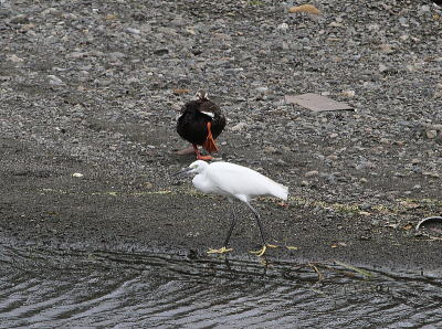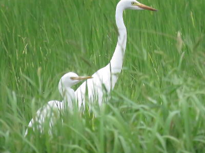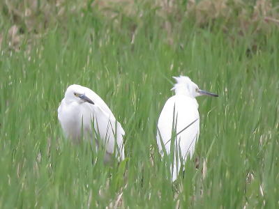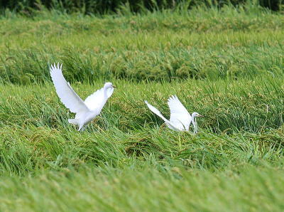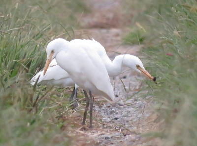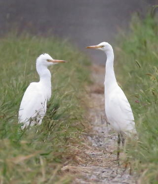 | アマサギ[9月27日] もう完全に冬羽です | アマサギ、チュウサギ[9月27日] 並ぶと大きさの違いが分かります | |