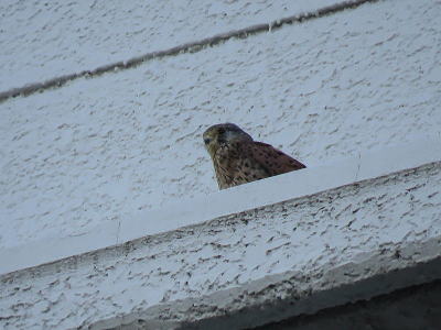 | カワセミ[9月4日] このころよく見かけます | チョウゲンボウ[9月2日] 餌を持ってマンションの軒先の上に止まり食べていました | |