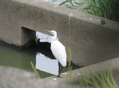 | キセキレイ[9月4日] やっと見かけるようになりました | ダイサギ、カワセミ[9月4日] あまりにも大きさが違いすぎます | |