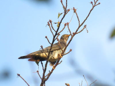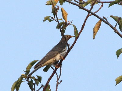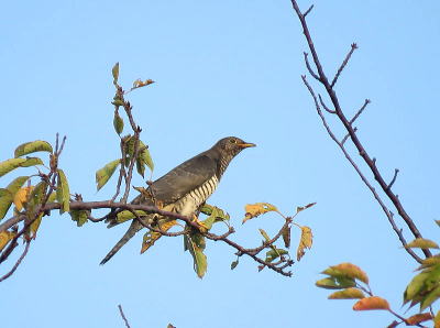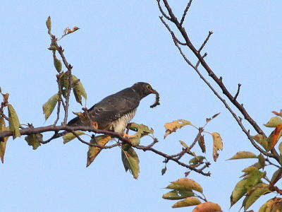 | ツツドリ[9月21日] 大きな虫を獲りました | ツツドリ[9月21日] 頭上を飛び高い桜の枝に止まりました | |