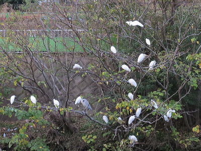 | ジョウビタキ[11月13日] ♂は暫くぶりです | コサギ、ダイサギ、アオサギ[11月11日] 川べりに塒がありました、次々に飛んで来て35羽まで数えました | |