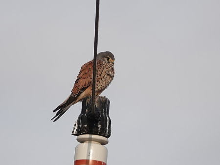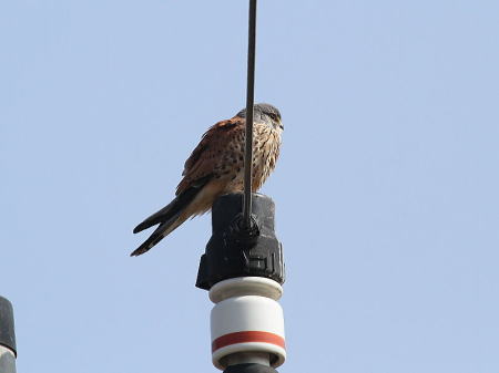 | カワラヒワ[2月19日] 田圃に下りて採餌します | チョウゲンボウ[2月19日] 先日のと同じです、この辺りが気に入っているようです | |