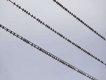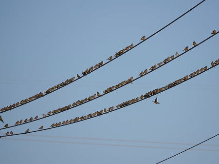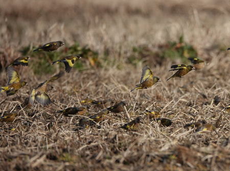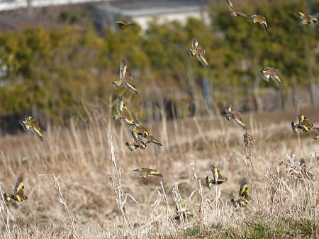 | カワラヒワ[2月19日] 150羽以上の群れでした | カワラヒワ[2月19日] 飛び立つとき羽の黄色い模様が綺麗です | |