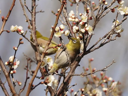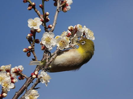 | メジロ[2月11日] 梅が咲き始めよい香りがしています | メジロ[2月11日] 蜜を吸いにやって来ました | |