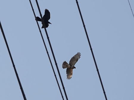 | カシラダカ[2月25日] 遊水地にもいました | ハシボソガラス、ノスリ[2月24日] ノスリが悠々と飛んでいましたが、カラスに見つかり追いかけられています | |