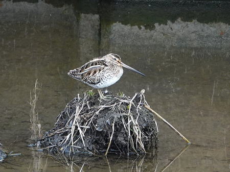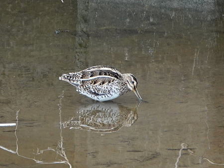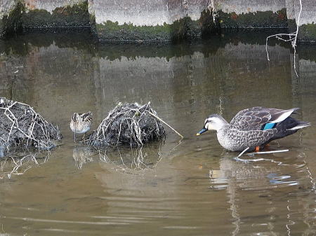 | タシギ[2月21日] 満腹して休んでいます | タシギ、カルガモ[2月21日] タシギが採餌中です、カルガモも採餌しながら近づいて来ました | |