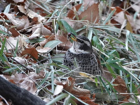 | ツグミ[2月10日] 顔を突っ込むたびに榎の実をくわえていました | ツグミ[2月10日] ガサガサと落ち葉をかき分けていました | |