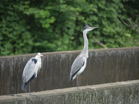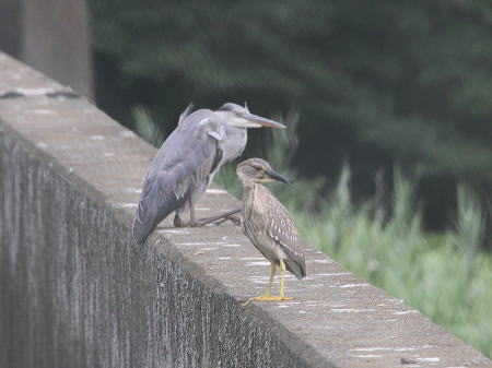| イソシギ[7月4日] 川の中州で採餌中。 | ゴイサギ、アオサギ[7月4日] 堰堤にホシゴイと疲れた様子のアオサギがいました。 | |