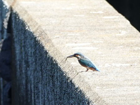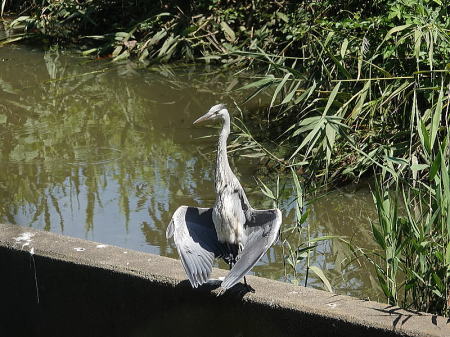 | カワセミ[7月10日] 何度も何度もトライしてやっと小さな獲物が獲れました。 | アオサギ[7月10日] こういう姿を時々見かけますが、羽を乾かしているのでしょうね。 | |