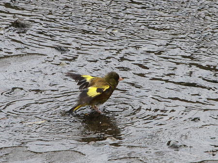 | ハグロトンボ[7月7日] 先へ先へと道案内するように飛んで行きます。 | カワラヒワ[7月7日] 蒸し暑い日です、気持ちよさそうでした。 | |